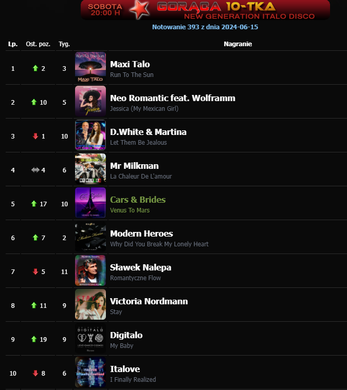 15 июня на польском радио RM-80 вышел очередной еженедельный хит-парад исполнителей Italo Disco New Generation. По итогам этой недели ШЕСТЬ песен российских проектов вошли в "Горячую десятку" NEW Italo Disco. И снова НАШИ - в числе лучших из лучших. Более того, в первые за два года, среди песен в основной десятке ПОЛОВИНА так или иначе имеют отношение к России. Основная ДЕСЯТКА Победитель этой недели - Maxi Talo с песней "Run To The Sun". Это только четвертая песня этого польского проекта и слушается с большим удовольствием. Российско-латвийский дуэт Neo Romantic feat. Wolframm с песней 2023 года "Jessica (My Mexican Girl)" занимают ВТОРОЕ место. Это лучший результат Александра Панова и Андрея Волкова, с момента попадания этой песни в хит-парад! Победители прошлой недели - российско-польский дуэт D.White & Euro Martina с песней "Let Them Be Jealous" на этот раз на ТРЕТЬЕМ месте! Поздравляем команду Дмитрия Белого с блестящим результатом - песня в тройке лучших песен NEW ITALO Disco уже