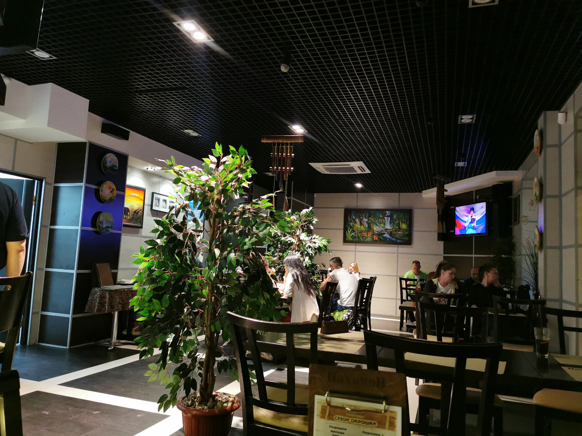 Удивило местечко в городе Покров. Хотели посмотреть на Введенский монастырь, который находится на острове в озере, но время было позднее, а въезд на территорию только до 19. Поэтому решили поужинать перед заселением в отель. Сын нашёл первое попавшееся заведение по приличным отзывам. Как-то по окраине доехали до этого ресторана. Темнеет, странные персонажи по дороге, стремненько. Подъезжаем. Парковка ок, людей на веранде много. Заходим внутрь, тёмно, свет приглушенный, не очень люблю такие места. Какая-то музычка. Девушка сначала была недоброжелательной. Тут, говорит, кондиционер, выключить нельзя, если дует, пересаживайтесь. Строгая такая. Ок. Остались под кондиционером. Заказали. Меню липкое и потрепанное, с ошибками, но цены намного ниже московских. Ждём. Людей прибывает, музыка все громче. Идем мыть руки. Комната уборная никак не обозначена, находим на ощупь, ручка почти упала. Но внутри более менее. А вот потом приносят еду: говяжьи медальоны божественны! Тают во рту! Мягкие, кра
