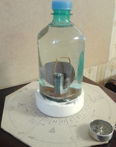 Однако астрофизические наблюдения традиционными методами ничего особенного не замечают. Чтобы подтвердить предположение о влиянии скрытых Миров, пришлось изобрести новый датчик-балансир, который имеет единственную степень свободы – вращение в вертикальной плоскости. Я был абсолютно уверен, что эта конструкция позволит избежать влияния шумов и обязательно откликнется на наступление нового сидерического цикла (так и получилось!). Здесь представлена фотография датчика, установленного на специальном трафарете, с учётом геодезической системы координат и движения Земли. Балансир в виде медного диска с обезвешивающей накладкой находился в герметичном сосуде, заполненном жидким парафином. Я начал эксперимент заранее, в первых числах декабря 2021 года.