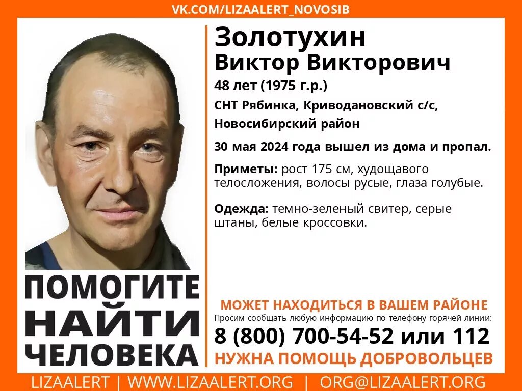 В СНТ Рябинка Новосибирской области пропал Виктор Золотухин. Мужчина 30 мая 2024 года вышел из дома и пропал. Об этом сообщает поисковый отряд «ЛизаАлерт». Приметы пропавшего — рост 175 см, худощавого телосложения, волосы русые, глаза голубые. Мужчина был одет в темно-зеленый свитер, серые штаны и белые кроссовки. Если вам что-либо известно о местонахождении пропавшего, сообщите, пожалуйста, по телефону горячей линии отряда 8-800-700-54-52 (круглосуточно, бесплатно) или по номеру 112. Ранее мы писали, что в СНТ Мичуринец под Бердском пропала Мария Рузаева (Опрышко). 83-летняя пенсионерка сегодня ушла в неизвестном направлении. Вячеслав Зубарев