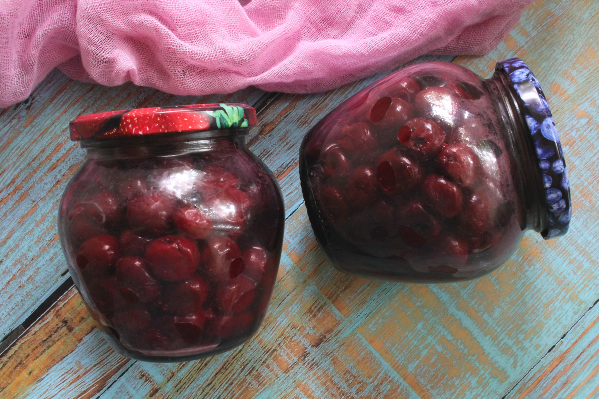 Этот рецепт очень простой, нам понадобятся только вишня. Но вишня нужна спелая, сладкая, сочная. Я использую самые крупные ягоды, которые у нас продаются, это вишня сорта "Шпанка". Эта заготовка великолепная, готовая вишня будет вкусная, практически как свежая. Если вы не употребляете сахар, то заготовьте ягоды по этому рецепту. Зимой такая вишня пригодится ну просто для всего! Ее можно есть просто так, использовать для начинок, для сладкой выпечки, десертов, для приготовления напитков. Вишня - 1 кг. Вишню надо будет промыть и почистить от косточек. Сразу выкладываем ягоды по баночкам, в которых она и будет храниться. Ягоды укладываем плотно, пусть свободного места в банке будет как можно меньше, но приминать ягоды не надо. Готовые ягоды довольно сильно потеряют объем. Самые большие банки, которые я использую для этой заготовки - литровые, но больше мне нравятся небольшие баночки, по 500 мл. Когда мы раскладываем вишню, то уже видно, что в банках будет достаточно много сока. Далее на п