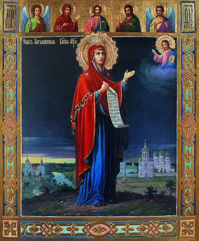 Это одна из древнейших икон в России. Её написали по просьбе благоверного князя Андрея Боголюбского в память о явлении ему Божией Матери. По молитвам перед этим образом были совершены многочисленные чудеса и исцеления. Празднование этой иконы - 1 июля. В 1155 году благоверный Андрей переезжал из Вышгорода в Суздаль. У него был с собой образ Божией Матери, который написал сам евангелист Лука. Впоследствии этот образ получил название Владимирской иконы Богородицы. Не доезжая Владимира, лошади, которые везли образ, остановились и не двигались с места. Тогда было решено отслужить молебен перед иконой. После этого князь решил ещё помолиться в своём шатре. Тогда и явилась ему Пречистая со свитком в правой руке. Она велела князю отвести её образ во Владимир, а на этом месте поставить храм и святую обитель. После Божия Матерь подняла руки к небу, где явился сам Спаситель, благословляя её. На этом месте Андрей Боголюбский заложил храм, который был освящён в честь Рождества Пресвятой Богородицы,