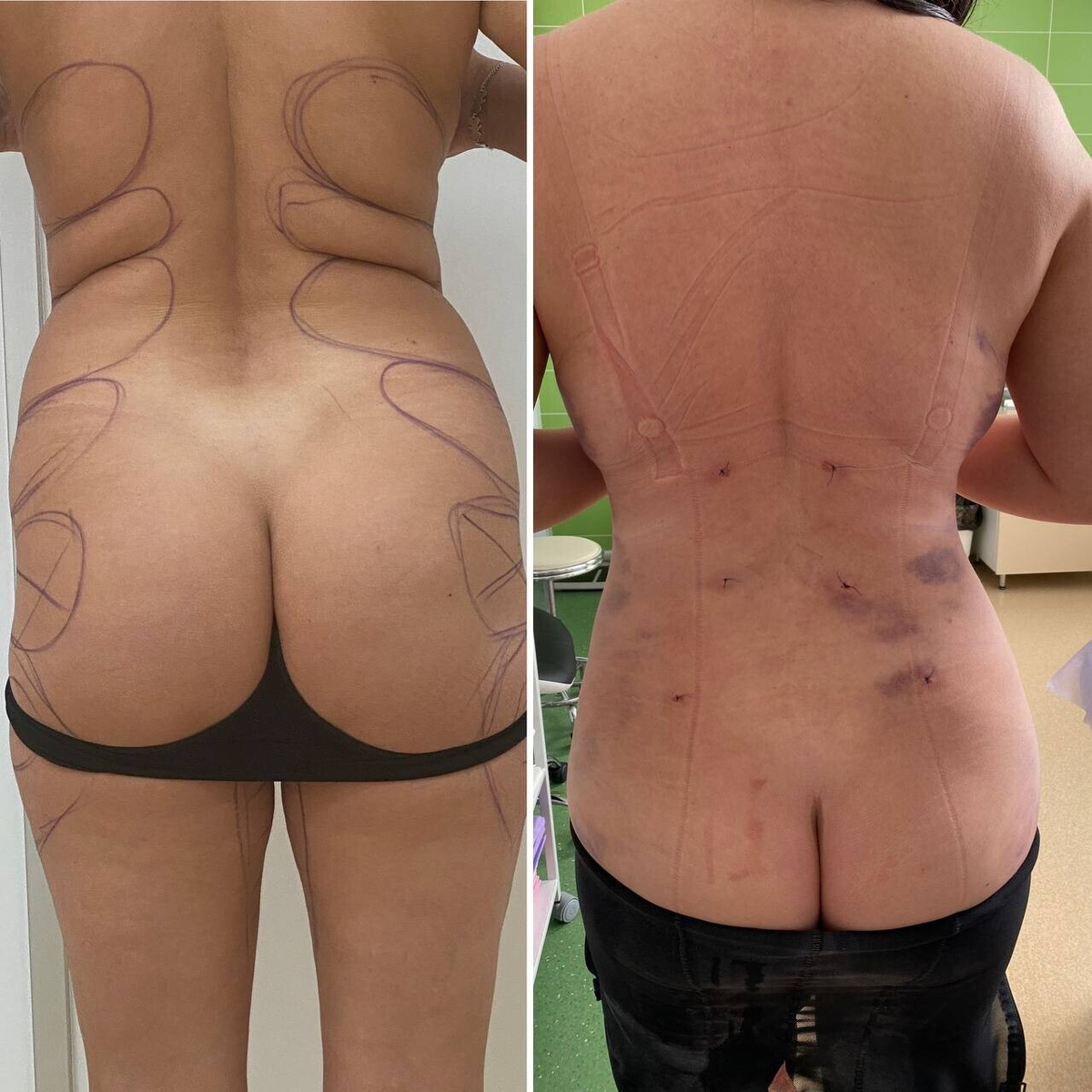 До и после липосакции и липофилинга ягодиц. Второе фото сделано на следующий день после операции. Добрый день! В данном случае пациентка предъявляла жалобы на складки на спине, дефекты контуров фигуры, ягодичные ямки.