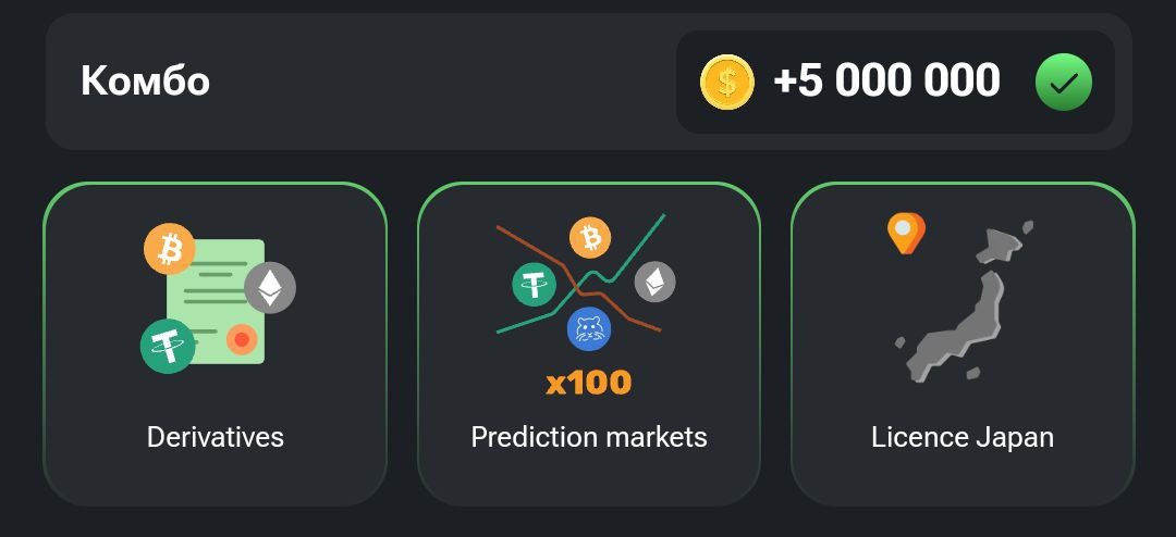 Hamster Combat - популярная игра внутри Телеграмма и 150 миллионов игроков тому подтверждение. Смысл игры заключается в заработке внутриигровой валюты, перед тем, как она выйдет на активный рынок Криптовалюты. Тем самым ЛЮБОЙ человек БЕЗ ВЛОЖЕНИЙ может заработать!!! Актуальные комбо-карты на 16-17 числа: 1.Карточка - Derivatives 2.Карточка - Prediction markets 3.Карточка - Licence Japan Завтра будет НОВЫЙ ПОСТ, так что подписывайтесь🫲👀 и сохраняйте, чтобы не потерять! САМОЕ ВАЖНОЕ❗❗❗ НЕ СТРЕМИТЕСЬ СРАЗУ ЖЕ ПОТРАТИТЬ ВСЕ ДЕНЬГИ НА ПРОКАЧКУ КАРТ ПАССИВНОЙ ПРИБЫЛИ! Иначе на следующий день раздачи у вас не будет средств на приобретение новых карт