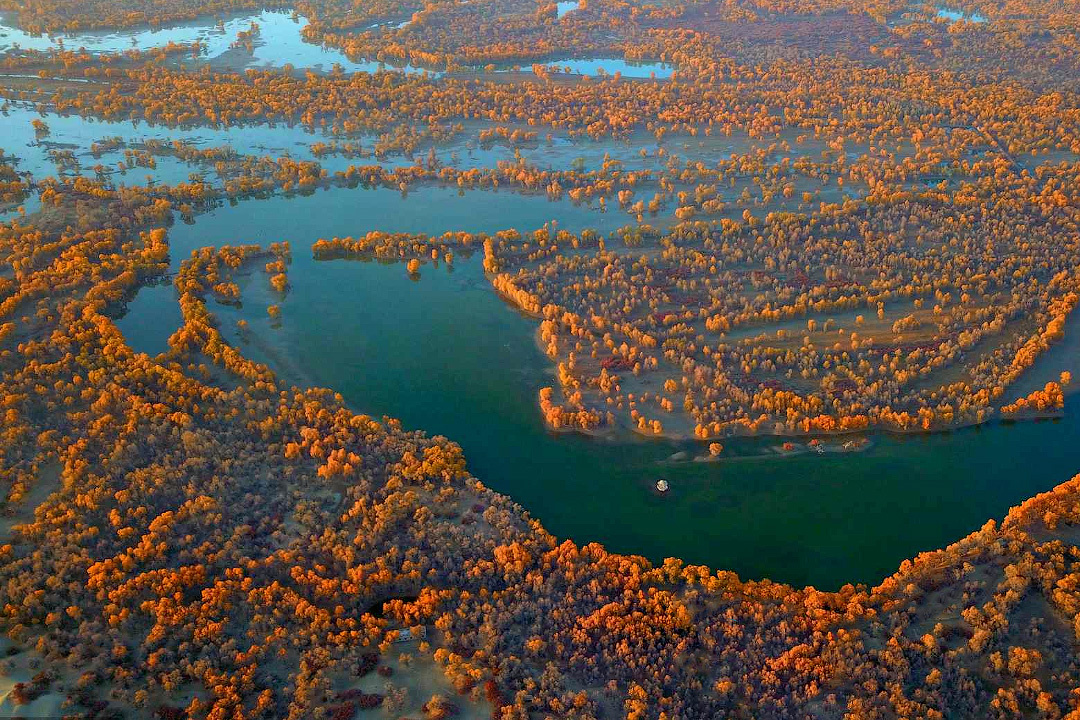 Осенью деревья покрываются золотистой листвой, преображая ландшафт в сюрреалистичную картину золотого леса, стоящего в пустыне и окаймляющего лабиринты реки, текущей в никуда.