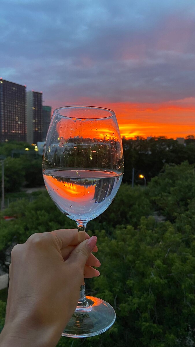 Закат - это когда природа, дарит нам красивую картину. Иногда этот момент видим в неожиданных местах, например в бокале. Огненные оттенки, отражающие в стакане, придают атмосферу и загадочность внутри бокала. Наблюдая, чувствуешь себя, как волшебник, который держит в руках кусочек небесного свода.