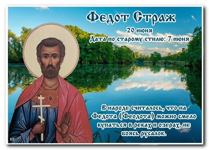 По народному календарю – Федот Страж. Считалось, что на Федота можно смело купаться в реках и озерах, не боясь русалок. Говорили, что в этот день святой сидел у воды с острым серпом и, если видел русалку, то сразу обрезал ей волосы серпом. А ведь именно в волосах у русалок скрыта вся колдовская сила, поэтому речные девы Федота боялись. Судили по приметам и о будущей погоде: если гремел гром — ожидали долгого ненастья, а если он к тому же переходил с места на место — это предвещало град и холод.