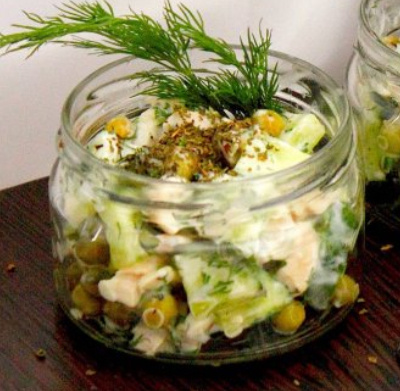2 порции, 30 минут Состав : Куриная грудка 100 г Огурец 1шт Горох зеленый 2 ч. л. Йогурт греческий 60 г Соль по вкусу Укроп по вкусу Мята свежая по вкусу Куриную грудку (можно заменить индейкой) отварить до готовности и дать остыть. Огурец и грудку нарезать кубиками. В отдельной миске смешать йогурт, соль, мелко нарезанные укроп и мяту. В порционную посуду выложить грудку, огурец, добавить горошек и заправить соусом. Приятного аппетита! Пищевая ценность 100 г Белки 62,1 % Жиры 7,8% Углеводы 30,2 % КИЛОКАЛОРИЙ 41