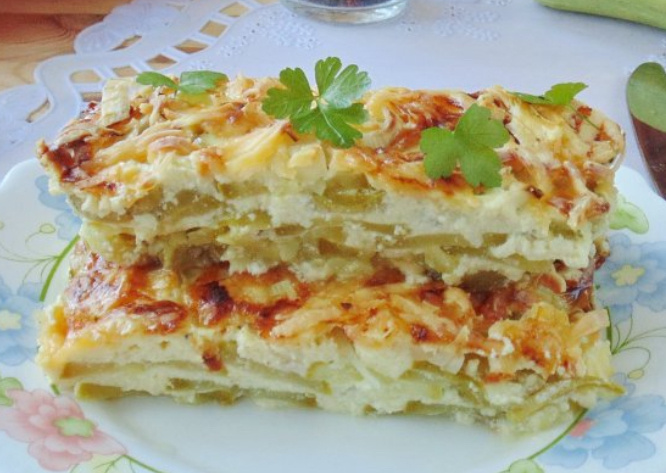Продолжаем готовить блюда из кабачков в летнем сезоне. Особенно вкусной такая запеканка получается, когда кабачки молоденькие с тонкой шкуркой и мелкими семечками. Творог в данном рецепте служит заливкой. Лучше брать его кремовой, однородной консистенции. Запеканка получается сочной, нежной, легкой, полезной и вкусной. Такое блюдо можно рекомендовать для диетического и детского питания. 6 порций, 1 час 10 минут Ингредиенты : Сливочное масло 10 г Творог 5-9% жирности 200г Молоко коровье 30 мл Чеснок 2зуб Кабачок 400гр Лук репчатый 40г Соль по вкусу Перец черный молотый по вкусу Орегано сушеный 3гр Российский сыр 50 г Яйцо куриное 1 шт ШАГ 1 Творог выложите в миску. ШАГ 2 Добавьте к творогу яйцо. ШАГ 3 Добавьте НЕМНОГО молока. ШАГ 4 Поперчите по вкусу. Если будете запеканку давать детям, то перчить не стоит. Добавьте сушеный орегано. ШАГ 5 Посолите по вкусу. ШАГ 6 Чеснок очистите и измельчите. Добавьте к творог, яйцо и молоко. ШАГ 7 Хорошо взбейте блендером смесь творога, моло