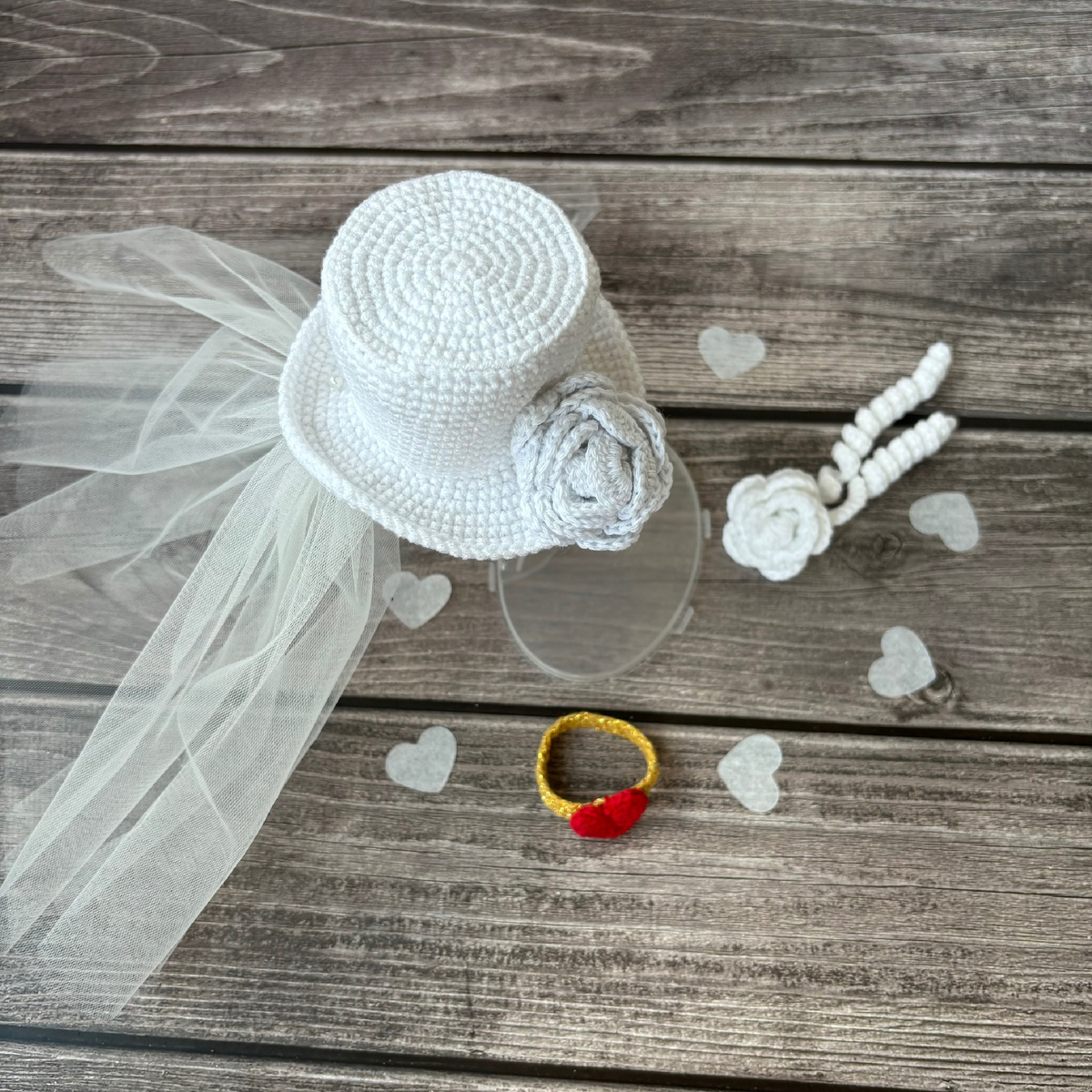 Вяжем маленькую розочку для чокера невесты. Поворотными рядами. В начале оставляем длинный конец нити, чтобы собрать розочку. 1 ряд: 12 вп 2 ряд: 2 впп, 2 вп, 1 ссн в последнюю 12-ю вп, далее в каждую петлю провязываем (1 ссн, 2вп, 1 ссн) 3 ряд: 1 впп, под вп предыдущего ряда провязываем (1 сбн, 5 ссн, 1 сбн), 1 сс. Собираем розочку при помощи оставленного длинного конца нити. Не отрывая нити, вяжем спиральки: 1-я 50 вп, со второй петли от крючка 49 прибавок, 2-я 35 вп, со второй петли от крючка 34 прибавки. Нить отрезаем подлиньше, чтобы завязать вокруг шеи Ленивца. Или провязываем завязку чокера из цепочки из вп.