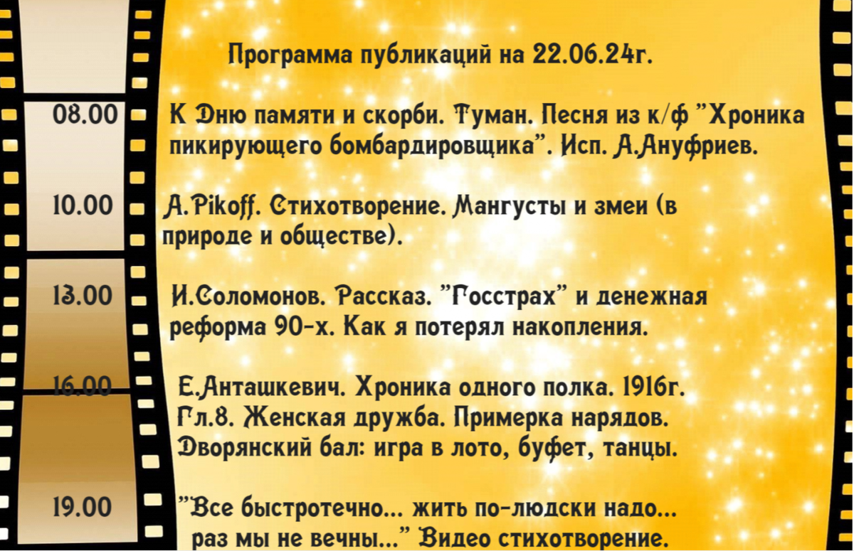 - Акустик (Из записок подводника). Немного грустная история любви офицера-акустика подводной лодки и дочери командира дивизии. - 40К дочитываний. Часть 1. Начало - 20К дочитываний. Часть 2. Продолжение ====================================================== - День Памяти и Скорби - День начала Великой отечественной войны. В День памяти и скорби хотим каждому пожелать мира и здоровья. Пусть никогда ни нам, ни нашим детям, ни внукам не придётся просыпаться от страшных звуков войны. Цените то, что имеете, берегите себя и близких, с благодарностью и теплотой души вспоминайте подвиги наших героев, с любовью и радостью встречайте каждый свой день. Историю памятной даты читайте здесь. ===================================================== - Троицкая родительская суббота. Все наши предки живы до тех пор, пока мы помним их, пока вспоминаем о том, как они жили и кем они были. Вспоминая усопших — мы даем им возможность жить вечно в наших сердцах. Пусть же в этот день вспоминаются только хорош