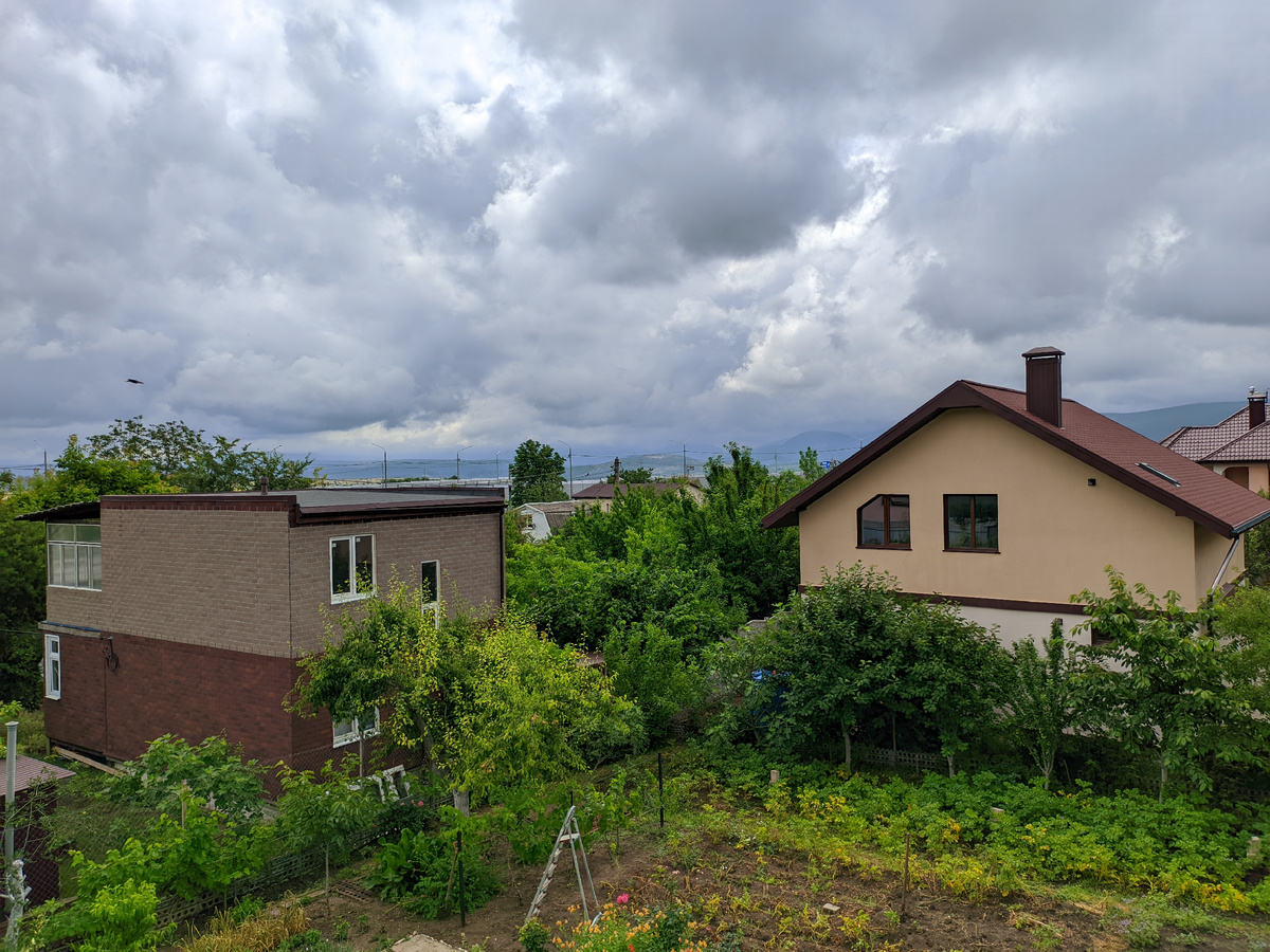 Весь вечер и ночью шёл дождь, то переходящий в ливень, то стихающий. Давно уже такого не было, но в этом году такие водные процедуры в Крыму редкость, вот и эта стихия заканчивается, на завтра прогноз солнечный, безоблачный и жаркий. Вроде всё, начинается жара крымского курортного сезона. Сегодня особенно ничем и не занимались, сад и огород полит, спасибо Природе. Весь день погода менялась, облачно, но солнце постоянно прорывалось сквозь толщу плотных облаков. И как только показывался просвет, наши тут же тащили свои хвосты на загар. Но даже когда солнце скрывалось за тучами, Собакевичи не уходили, терпеливо ждали жары. Одна Дымка пряталась в тени мангала. К ней кралась Тигра, настроение у собаки было игривое. Но видно потом вспомнился недавний бунт Дымки и решила её не трогать. Сама с собой может поиграть. Дымка подождала, пока Тигра наиграется и уйдет и заняла её место. Я же аккуратно, чтобы не наступать на мокрую землю, погулял по участку и снова проверил, нет ли чего подозрительно
