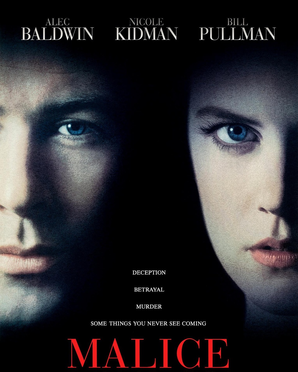 Malice (режиссер Харольд Беккер, 1993) Живёшь себе и думаешь, что посмотрела все фильмы с Николь Кидман (очень люблю эту актрису). Но внезапно из глубин интернета выныривает это кино, и выясняется: не все! Название даю оригинальное (на английском и французском оно переводится как "злоба"), а название на русском даже не начинайте гуглить, ибо это жесточайший спойлер (лучи поноса локализаторам в седом 1993, когда и слова "спойлер" ещё не существовало). "Злоба" - классный триллер в духе 90-х, и он построен как матрешка. Сценаристы (один из них - великий Аарон Соркин, который создал "Западное крыло", "Игру Молли", "Человек, который изменил всё") подкидывают зрителю несколько сюжетов-обманок, чтоб в итоге развернуть по-настоящему неординарную историю. В главных ролях - сногсшибательное трио: Алек Болдуин, Билл Пуллман, Николь Кидман. Все красивы до умопомрачения. Билл Пуллман менее других известен - я его обожаю со времён линчевского "Шоссе в никуда" и рекомендую с ним классный сери