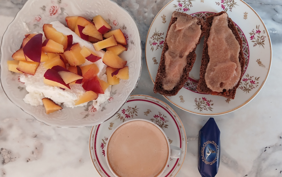 Экономное меню на 233 руб в день На завтрак у нас творог с персиками. Это 5% пластовой творог Вкусвилл. К нему - бутерброды с икрой сазана на домашнем ржаном хлебе. И конфетка Вдохновение к кофе. Завтрак на 439 ккал, в нем 37,5 г белка 💪 творога у меня 170 г (27,5 г белка), икры сазана - 20 г (5,6 г белка). Такая икра - хороший способ мало съесть и добрать нужный белок. Хлеба 45 г, в кофе - капля стевии (0 ккал) Икру сазана (трески, минтая) можно есть не только с хлебом, но и с отварным яйцом или овощами. На ломтики вареного картофеля положить. Я на завтра уже сварила картошку, к завтраку сделаю такие ломтики с икрой. По белку напомню: правильная норма его - 1-1,5 г на 1 кг вашего идеального веса. Жир и свой лишний вес мы белком не кормим! До 2 г белка едят спортсмены и кому особо показано (подростки, например). Для меня норма от 55-56 г до 84 г. В свою норму я укладываюсь всегда. В разные дни бывает разная цифра, но она всегда в пределах моей нормы. Свою норму белка каждый под се