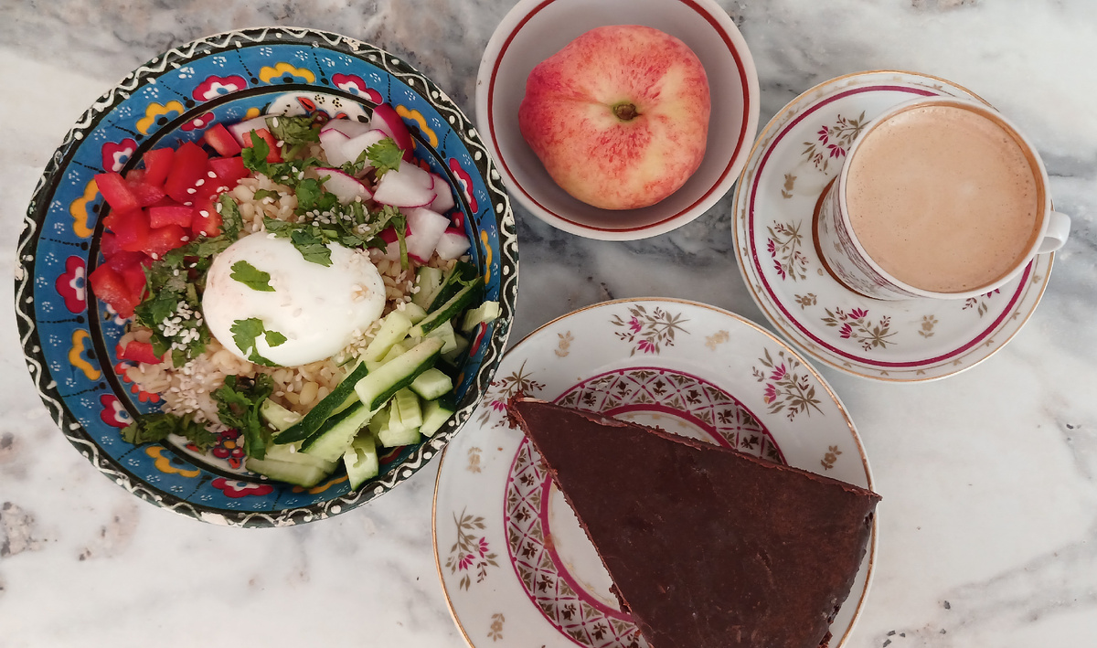 Экономное меню на 233 руб в день Вчера на ужин варила на гарнир булгур, варю крупы обычно сразу побольше, чтобы и на завтрак осталось. Поэтому на завтрак у нас сегодня боул с булгуром -с 5-тиминутным яйцом, овощами, кинзой, кунжутным маслом. Также персик плоский, чашка кофе и кусочек шоколадного торта Захер. Персик и половину торта я доела только во время перекуса позже. Торт пекла вчера, как раз оставалась последняя банка абрикосового джема, берегла ее для этого торта Супа на обед совсем не хотелось сегодня. Решила приготовить обед на скорую руку из того, что есть в холодильнике. Поэтому обедаем салатом с фунчозой и лепешками из лаваша с сыром, творогом и зеленью. Салат с фунчозой (использовала последнюю, ставлю в список покупок, очень мне нравятся такие салаты) - добавила огурец, болгарский перец, чеснок, кальмары, кунжутное масло и кинзу. Для лепешки смешала творог, зеленый лук и тертый сыр, завернула в лаваш конвертиком и обжарила на сухой сковороде. Я от своей лепешки тольк