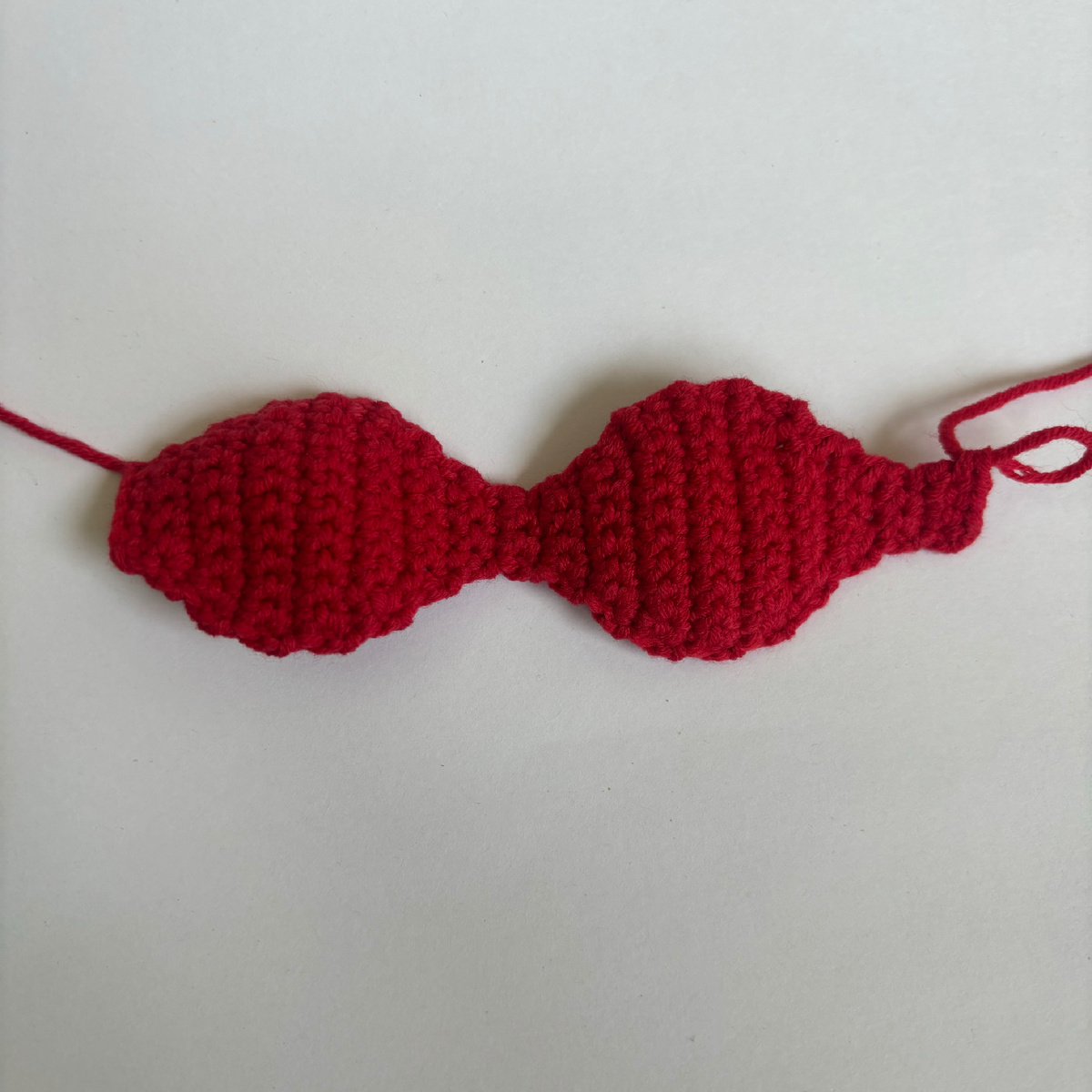 Вяжем галстук-бабочку для жениха Ленивца. Схема моя) Вяжем поворотными рядами. Оставляем в начале конец нити около 25-30 см. 1 ряд: 6 вп 2 ряд: со второй петли от крючка 5 сбн 3 ряд: 1 впп, поворот, 5 сбн 4 ряд: 1 впп, поворот, пр, 3 сбн, пр = 7 сбн 5 ряд: 1 впп, поворот, пр, 5 сбн, пр = 9 сбн 6 ряд: 1 впп, поворот, 1 сбн, пр, 5 сбн, пр, 1 сбн = 11 сбн 7-10 ряды: 4 ряда: 1 впп, поворот, 11 сбн 11 ряд: 1 впп, поворот, 1 сбн, уб, 5 сбн, уб, 1 сбн = 9 сбн 12 ряд: 1 впп, поворот, уб, 5 сбн, уб = 7 сбн 13 ряд: 1 впп, поворот, уб, 3 сбн, уб = 5 сбн 14 ряд: 1 впп, поворот, 5 сбн 15 ряд: 1 впп, поворот, уб, 1 сбн, уб = 3 сбн 16-18 ряды: 3 ряда: 1 впп, поворот, 3 сбн 19 ряд: 1 впп, поворот, пр, 1 сбн, пр = 5 сбн 20 ряд: 1 впп, поворот Повторяем вязание с 4 по 20 ряды = 21 по 36 ряды. Сшиваем с краем начального ряда оставленным концом нити. Не отрывая нити, продолжаем вязание. 37 ряд: 12 вп 38 ряд: со второй петли от крючка 11 сбн 39-40 ряды: 2 ряда: 1 впп, поворот, 11 сбн Сшиваем края. Нить