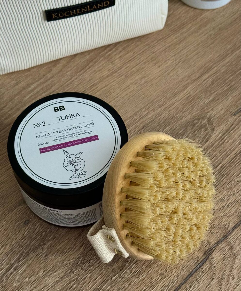 Я люблю утро по выходным: будильник не трезвонит, кофе по-особенному вкусный, и есть время на мини-ритуалы, которые доставляют радость. Одна из таких прелестей — это сухой массаж тела. Он способствует обновлению кожи, стимулирует кровообращение и лимфоток. Круто снимет отечность. Ну что еще надо для счастья? 👏🏼 После процедуры всегда наношу крем на тело, чтобы напитать кожу 🧖🏼♀️ Тут уже хочу похвастаться крутой бюджетной находкой. ВкусВилл постоянно совершенствует и расширяет свою линейку уходовой косметики. Новый крем для тела быстро впитывается и хорошо увлажняет кожу. Про аромат Тонки хочется написать отдельно, он настолько приятный и благородный, что даже не верится, что это бюджетный продукт)) Цены на уход, конечно, не очень демократичные, но что сейчас дешево? Крем стоит в районе 600 рублей. Щетку для массажа покупала в Cozy home. 💋