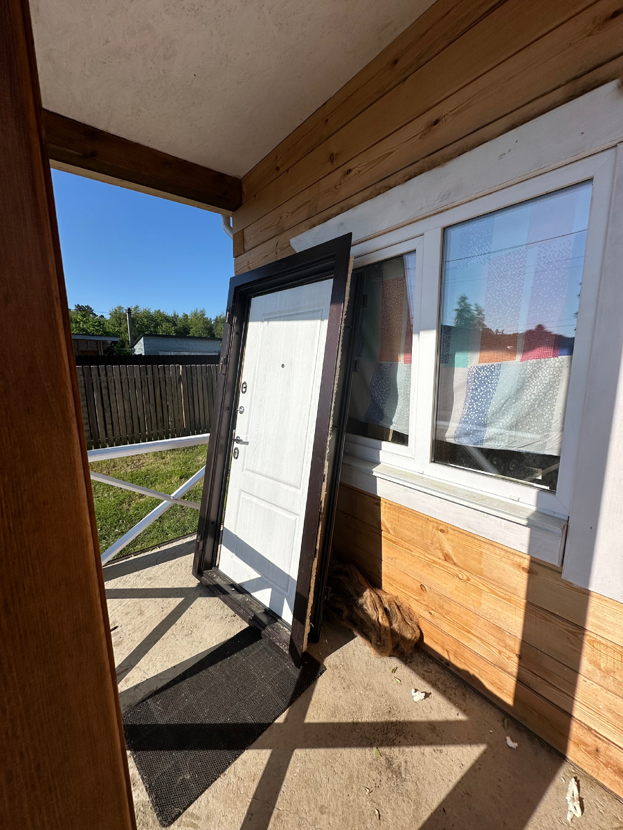 В субботу мы воодушевленно (нет) встали в шесть утра и с не меньшим воодушевлением (нет) поехали в дом на важное дело. Плюс 100 к настроению добавляло то, что моему старому шнауцеру в первом часу ночи захотелось в туалет и пришлось с ним ночью гулять. Но дело не ждало и пришлось ехать невыспавшимися и злыми. Важное дело - это переустановка двери. То, что дверь стоит неправильно, было понятно уже с первых дней. Во-первых, она перестала нормально открываться и закрываться. В какой-то момент я даже не смогла сама попасть в дом и два часа стояла на улице в ожидании подмоги. Во-вторых, стены вокруг двери не садились вместе с остальным домом, из-чего образовались сквозные щели на улицу, что не очень приятно было бы зимой. Итак, мы приехали и первым делом демонтировали дверь вместе с коробкой. После демонтажа вскрылись все ошибки, сделанные строителями: 1) отсутствие обсадочной колоды. Вместо нее прямо к стене были гвоздями приколочены доски. На вертикальных досках был прибит еще брусок по