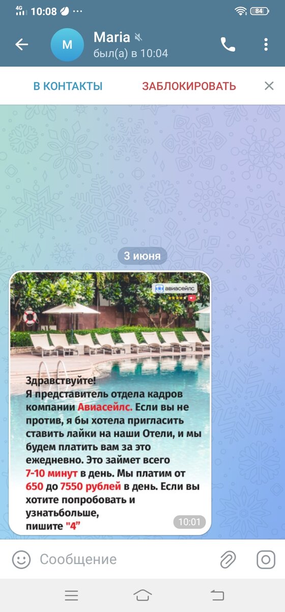 Лично меня всегда настораживает то, что тебе в личку какого-либо мессенджера пишет неизвестный и предлагает работу. С чего бы это? Обычно это ты звонишь и пишешь работодателю, а никак не наоборот. Тем не менее, многие соглашаются, так как условия часто очень заманчивые. Во всяком случае, некоторые думают – ну просто посмотрю, попробую, не понравится, так откажусь сразу. Однако на самом деле мошенники часто так мастерски разыгрывают свои представления, что ты уже и сам не замечаешь, как оказался втянутым в их мудреные схемы и даже отдал свои кровные. Ну вот мне на днях в личные сообщения ТГ пришло приглашение поработать от неизвестного абонента без авы. Выглядело оно так. Вместо написанного текста – просто картинка с объявлением. Мошенники замаскировались под крупнейший сервис по поиску и покупке авиабилетов. Условия шикарные – никаких знаний и умений не надо, занятость всего лишь 10 минут в день, а получать будешь – 7 тысяч рублей. Причем не в месяц, а в день. Просто сказочная халя