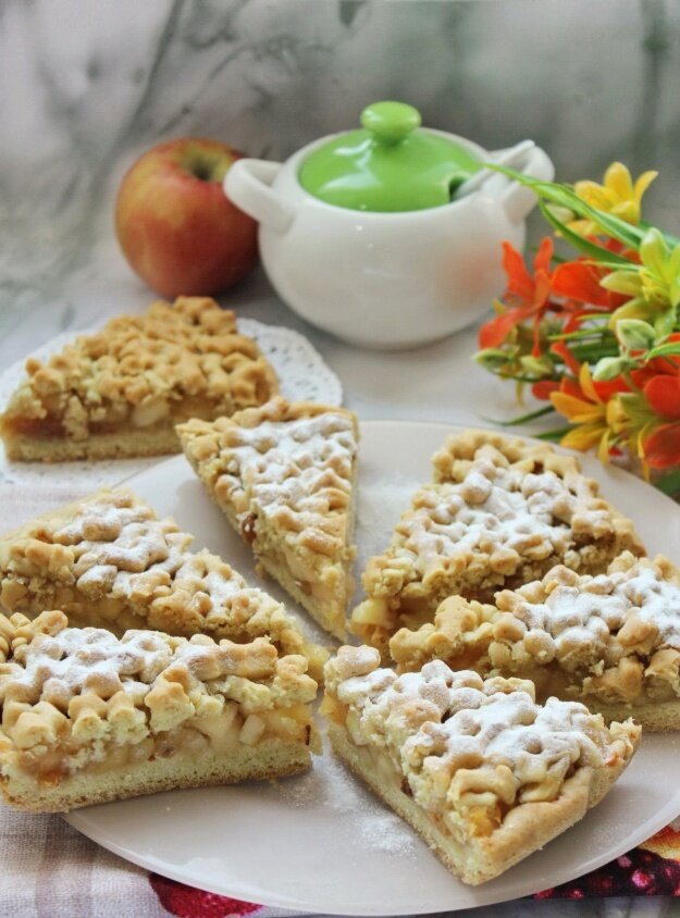 6.Тем временем приготовьте начинку для пирога. Яблоки помойте, очистите, удалите сердцевину. Половину яблок натрите на терке, а половину нарежьте небольшими кубиками.