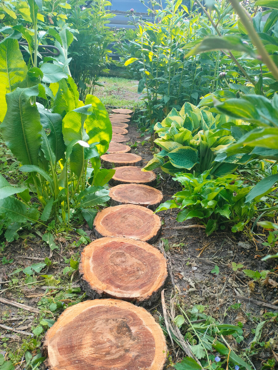 - деревянные спилы, как нельзя кстати, пришлись на клумбу, доставшуюся от прежних владельцев дачи и к которой я несколько сезонов не знала, с какой стороны подступиться