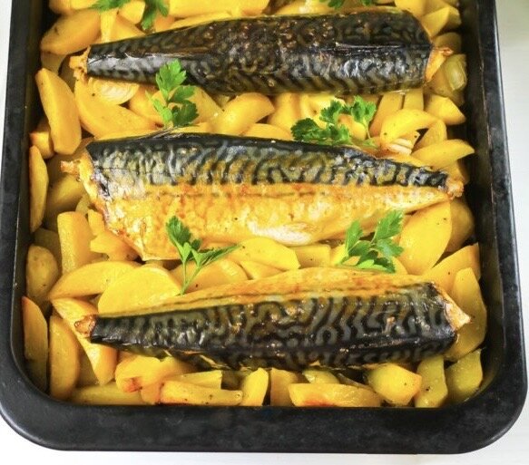 Невероятно вкусное горячее рыбное блюдо – скумбрия в духовке с картошкой.