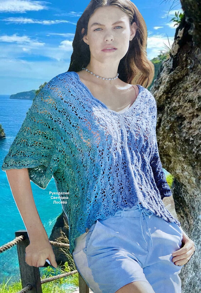Уникальность этой модели топа заключается в её дизайне и технике вязания. Изделие связано спицами с использованием ажурного узора, что придаёт ему воздушность и лёгкость. Поперечное вязание обеспечивает свободу движений и комфорт в носке. Топ выполнен из дышащего хлопка синего цвета, который приятен к телу и позволяет коже «дышать».