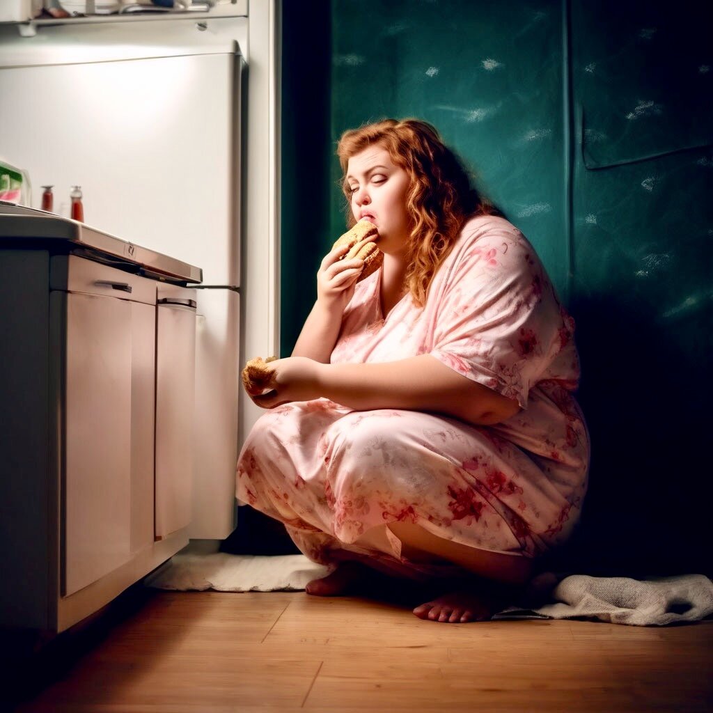 Перепугавшись не на шутку, Георгий бросился на звук. Ноги привели его на кухню, где, в тусклом свете, льющемся из открытой дверцы холодильника, глазам изумлённого мужчины предстала невероятная картина: его Валюша в ночной сорочке и босиком сидела прямо на полу и держала в руках гигантских размеров бутерброд. Между двумя толстыми кусками батона, щедро смазанными сливочным маслом, плотно прижатые друг к другу, виднелись ломтики сырокопченой колбасы, ветчины, маринованных огурчиков... Валя откусывала от этого бутербродного монстра огромные куски и старательно жевала, жмурясь и причмокивая. По щекам женщины текли слезы, а когда, прожевав очередной кусок, она запивала все это газировкой из двухлитровой бутылки, раздавалось странное бульканье. Иногда женщина будто бы приходила в себя, осматривала все это безобразие и начинала рыдать ещё горше, всхлипывая и подвывая.