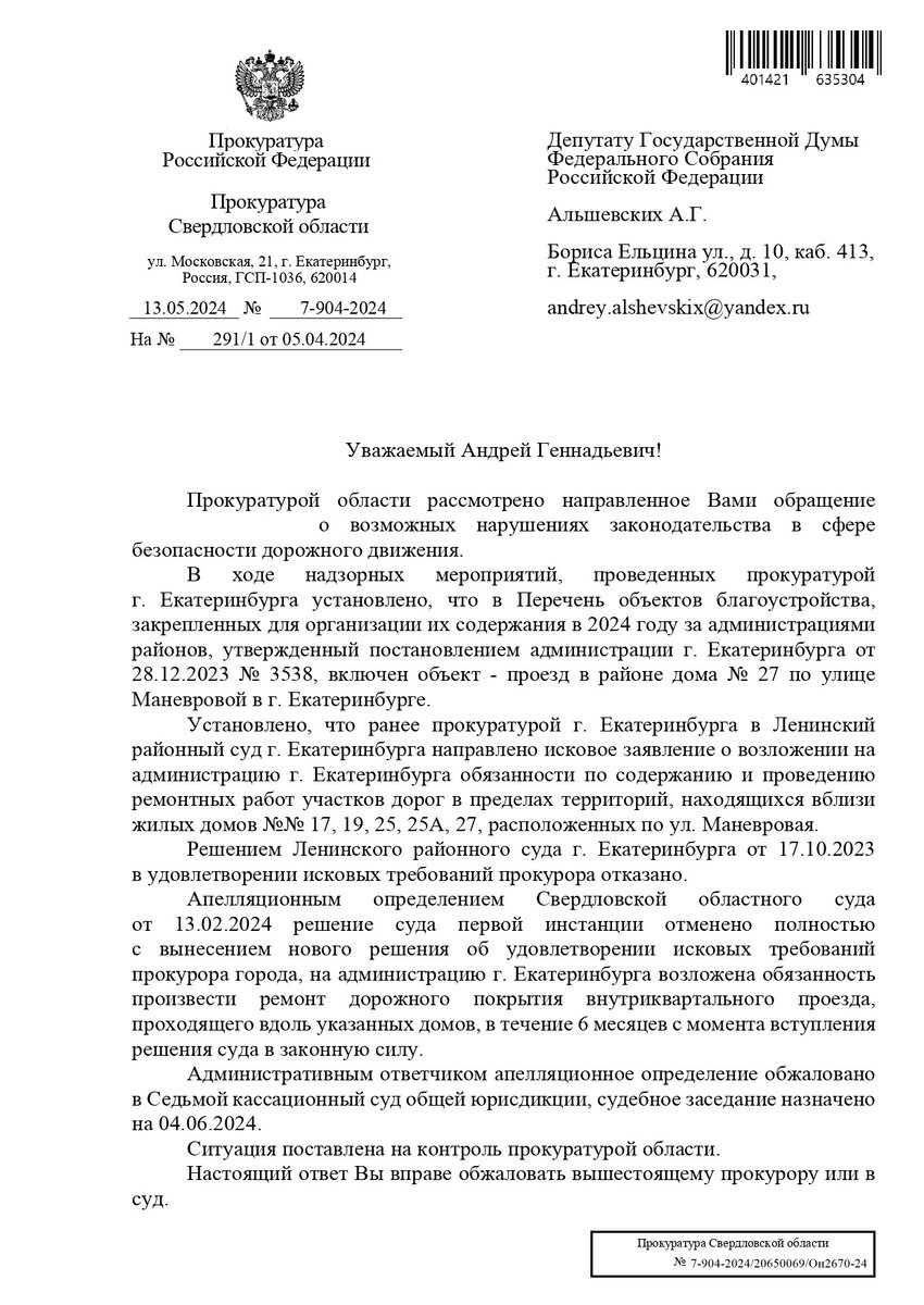 В прошлом году прокуратура требовала, чтобы власти Екатеринбурга отремонтировали проезд возле нескольких многоквартирников на Маневровой.
