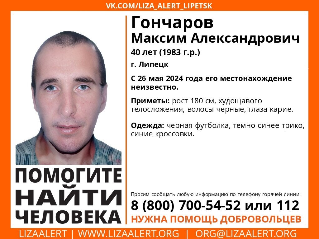 Больше недели в Липецкой области ищут пропавшего 40-летнего Максима Гончарова. 26 мая мужчина вышел из дома в Липецке и не вернулся. С того момента о местонахождении липчанина ничего не известно. Об этом сообщили в региональном отделении поисково-спасательного отряда «Лиза Алерт». Приметы Максима: рост 180 сантиметров, телосложение худощавое, черные волосы и карие глаза. В день исчезновения липчанин был одет в черную футболку, темно-синее трико и кроссовки синего цвета. Если вы видели пропавшего липчанина или что-то знаете о его возможном местонахождении, то сообщите об этом по телефонам — 112 или 8 (800) 700-54-52.