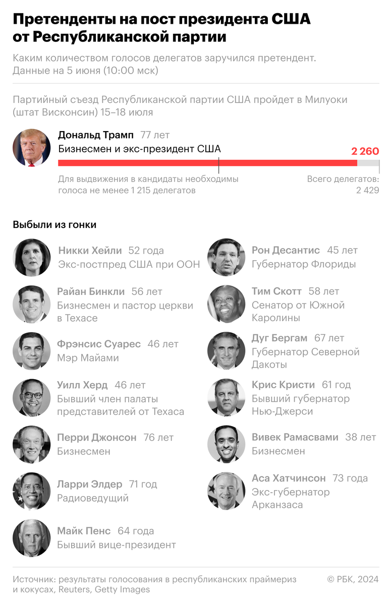 По итогам уверенно лидирует Дональд Трамп. Еще 12 марта экс-президент набрал «магическое число» — 1215 голосов делегатов, необходимых для формального выдвижения на пост президента. По состоянию на 5 июня (10:00 мск) политик заручился поддержкой уже 2260 делегатов на запланированном на июль партийном съезде. Таким образом, если 5 ноября не случится никаких форс-мажоров, то именно Трамп будет представлять Республиканскую партию на президентских выборах.