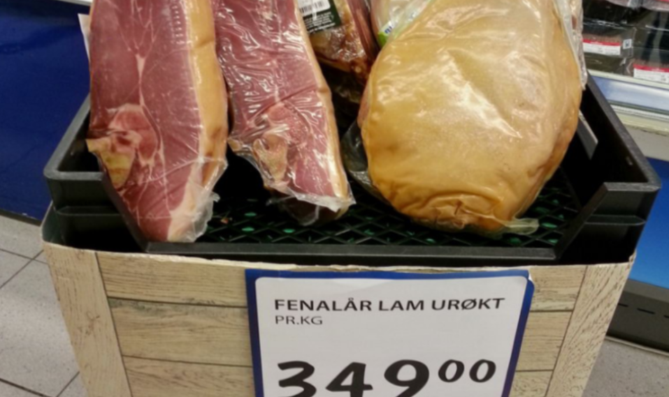 Вот это баранина. Стоит 349 крон, умножаем на 6, получается 2000 рублей на наши деньги. Понятно, с наших зарплат такое не купишь. Например, картофель для запекания на пикнике очень красиво упакован в бумагу. Но продается по одной штуке, и обойдется россиянину в 60 рублей каждый клубень. Огурцы на килограмм не продают, потому что они расфасованы по одной штучке, каждая из кот