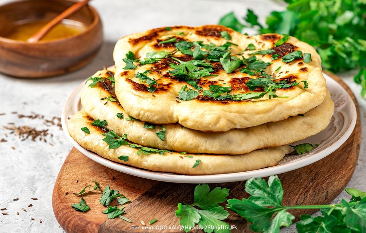 Июнь — время первой ароматной зелени, поэтому сегодня мы предлагаем рецепт нежных лепешек с творогом, брынзой и зеленью. Приготовить их можно легко и быстро: тесто поднимается всего за 10 минут! Главное — выбрать свежую зелень. Скорее готовить! Для приготовления теста вам понадобятся: кефир — 300 мл; мука — 400 г; соль — ½ ч. л.; сода — ½ ч. л. Для начинки: творог АШАН Красная птица «Создаем Хорошее» — 200 г; брынза — 200 г; зелень (кинза, укроп, петрушка, зеленый лук, черемша — подойдет любая) — по вкусу. Готовим! Шаг 1 В большой миске смешайте кефир, соду и соль. Тщательно перемешайте. Шаг 2 Добавьте муку и замесите тесто. После оставьте в теплом месте на 10–15 минут. Шаг 3 Готовим начинку. В отдельной миске размешайте творог с брынзой до однородности. Кстати, творог АШАН Красная птица, который используется в рецепте, производит наш партнер — молочный завод «Зеленоградское». Именно поэтому на упаковке продукта есть фирменный знак программы ответственного партнерства АШАН «Созда