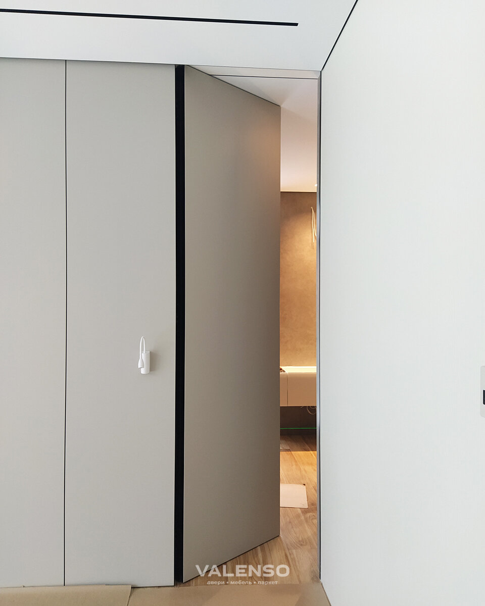Эти двери изготовили мы, а на фотографиях вы видите процесс монтажа. Двери высотой до потолка выполнены в версии без верхней траверзы. При таком решении плоскость потолка в дверном проёме ничем не разделяется и при открытой двери потолок выглядит единой плоскостью. Двери выполнены в лаконичном современном дизайне с чёрным алюминиевым профилем в торцах. Сами полотна в отделке стеклом с покраской и керамогранитом толщиной 6 мм. Керамогранит такой толщины и размера — это достаточно тяжёлый материал. И для того, чтобы полотно двери было стабильно, чтобы дверь выдерживала нагрузки, мы применили профиль собственного производства. Также наш профиль решает и вторую важную задачу: обеспечить единую плоскость керамогранита и поверхности стен. Гефест-80 - наш собственный профиль усиленной конструкции. Это алюминиевый профиль толщиной 80 мм, способный выдержать конструкцию полотна высотой до 4000 мм. Мы комплектуем его усиленными дверными петлями, каждая из которых выдержит вес до 180 килограмм. П