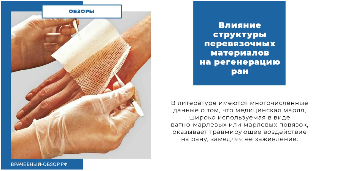 В литературе имеются многочисленные данные о том, что медицинская марля, широко используемая в виде ватно-марлевых или марлевых повязок, оказывает травмирующее воздействие на рану, замедляя ее заживление. Марлевые повязки прилипают к ране, поэтому при их смене значительно повреждается нарастающий эпителий, могут возникать повторные кровотечения, а само снятие повязки сопровождается сильной болью. По мнению ряда авторов, такая травматичность объясняется нестабильностью структуры марли, ворсистостью нитей (Л. Л. Гольдзанд; Е. А. Тартаковский; В. Ю. Кассин и соавт.; Beck; Baron; Schmidt).