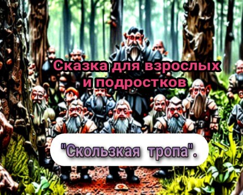 Гномы шли с песнями, шутками , так им было проще преодолеть возникающие на пути препятствия в виде гор , рек , холмов и др. За разговорами не заметили , что забрели глубоко в лес , где перед их глазами возникла та самая страшная скользкая тропа, была на вид мрачной, зловещей, бррр.