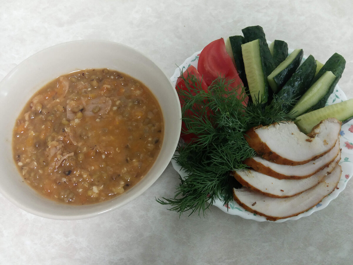 Фасоль Маш или бобы Мунг в нашем рационе относительно недавно, лет 6 назад я открыла для себя этот продукт. Мы хорошо едим фасоль, горох, чечевицу и бобы. Покупаю его на рынке, хотя он давно есть и в магазинах у нас. На вкус мне кажется присутствует легкая ореховая нотка. Маш использую в супе и на гарнир, сегодня приготовила суп по мотивам Узбекского блюда Машхурда, но без картошки и риса. В бобах мунг как и в чечевице очень много растительного белка, а еще они богаты клетчаткой! Для супа я отвариваю мясо, у меня филе бедра индейки, процеживаю бульон. Промываю холодной водой Маш. Бульон ставлю греться, как только он закипит засыпаю промытый Маш. После того как суповая основа закипит ставлю на средний огонь и варю под закрытой крышкой. Маш готовиться около 40 минут, он должен хорошо развариться и стать мягким. Важно! Маш солить нужно за минут 10 до готовности! Мясо я измельчаю и отправляю в бульон практически вместе с бобами. Мне удобно мясо разбирать на небольшие кусочки руками,