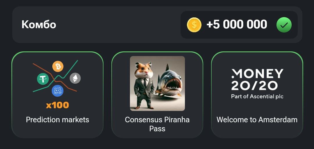 Hamster Combat - популярная игра внутри Телеграмма и 70 миллионов игроков тому подтверждение. Смысл игры заключается в заработке внутриигровой валюты, перед тем, как она выйдет на активный рынок Криптовалюты. Тем самым ЛЮБОЙ человек БЕЗ ВЛОЖЕНИЙ может заработать!!! Актуальные комбо-карты на 05-06 числа: Новые актуальные карты 👉тут👈 1.Карточка - Prediction markets 2.Карточка - Consensus Piranha Pass 3.Карточка - Welcome to Amsterdam Завтра будет НОВЫЙ ПОСТ, так что подписывайтесь🫲👀 и сохраняйте, чтобы не потерять! САМОЕ ВАЖНОЕ❗❗❗ НЕ СТРЕМИТЕСЬ СРАЗУ ЖЕ ПОТРАТИТЬ ВСЕ ДЕНЬГИ НА ПРОКАЧКУ КАРТ ПАССИВНОЙ ПРИБЫЛИ! Иначе на следующий день раздачи у вас не будет средств на приобретение новых карт