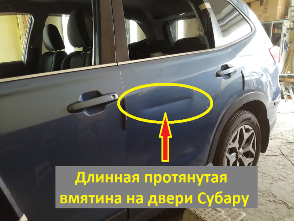 Длинная протянутая вмятина на двери Субару Форестер. Растяжение металла на грани допустимого. В эпицентре потёртости от контакта с препятствием. Берёмся выполнить беспокрасочный ремонт этой двери. Срок ремонта 1 день. На все вопросы по ремонту с удовольствием ответим по телефону или WhatsApp: