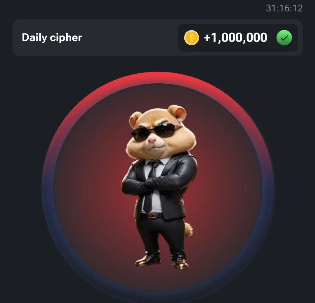 Привет, криптаны! На связи CryptoAlex. В хомяках ввели шифр морзянку, на 1 000 000 монет. Сейчас расскажу что делать! Откройте игру и быстро нажмите дважды на область, где написано "Прибыль за тап". Это сделает вашу монетку красной, а сверху появится "Ежедневный шифр". Теперь следует угадать шифр: Нажмите и удерживайте палец (несколько секунд), затем сделайте три быстрых нажатия (буква B). Подождите 3-4 секунды. Затем сделайте одно длинное нажатие (буква T). Снова подождите 3-4 секунды. Затем сделайте одно длинное нажатие, одно короткое, одно длинное, одно короткое (буква C). А чтобы точно ничего не пропустить и получать все новости в числе первых подпишись на мой Telegram-канал CryptoAlex.
