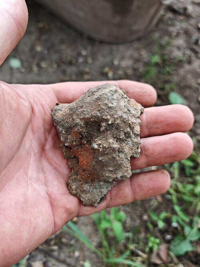 Всем привет. Довольно занятное место я нашел. Мне так кажется. Если покороче, то на землях, когда-то принадлежавших монастырю начали строить коттеджный поселок. До этого, десятки лет там был обычный пустырь. Начались всякие земляные работы и я решил там погонять с металлоискателем. И почти сразу-же нашел множество странных слитков: Небольшого размера, но довольно увесистые. Хм... Решил распилить их болгаркой, хотя изначально предполагал, что они медные из-за зеленых окислов... А пока продолжил поиски и нашел монетку: Это был пятак 1924 года... Ранний СССР. Давно не находил... Потом были куски (довольно увесистые) листовой меди: А эта монета лежала сверху - ее вымыло ливнем, что занимался накануне: Меди было действительно много, пусть и небольшими кусочками: Снова выпал пятак: Еще кое чего насобирал и все-же не терпелось распилить один из слитков: Болгарка аккумуляторная всегда со мной. Дело 5 сек... Блеснул желтый металл: Оказалось, что это скорее всего - латунь. Возможно здесь было ка