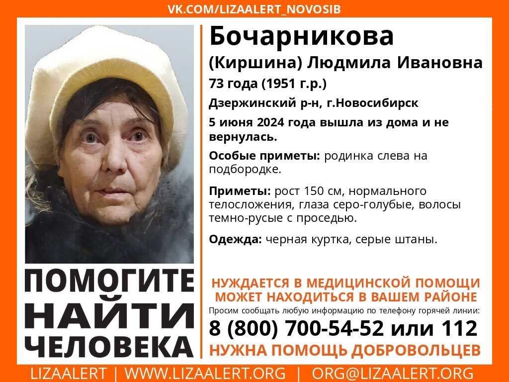 В Дзержинском районе Новосибирска пропала 73-летняя Людмила Бочарникова. 5 июня пенсионерка вышла из дома и не вернулась. Об этом сообщает поисковый отряд «ЛизаАлерт». Женщина была одета в черную куртку и серые штаны. Приметы пропавшей рост 150 см, нормального телосложения, глаза серо-голубые, волосы темно-русые с проседью. Из особых примет родинка слева на подбородке. Если вам что-либо известно о местонахождении женщины, сообщите, пожалуйста, по телефону горячей линии отряда 8-800-700-54-52 (круглосуточно, бесплатно) или по номеру 112. Ранее мы писали, что в Заельцовском районе Новосибирска пропал 58-летний Андрей Шемелин. Вячеслав Зубарев