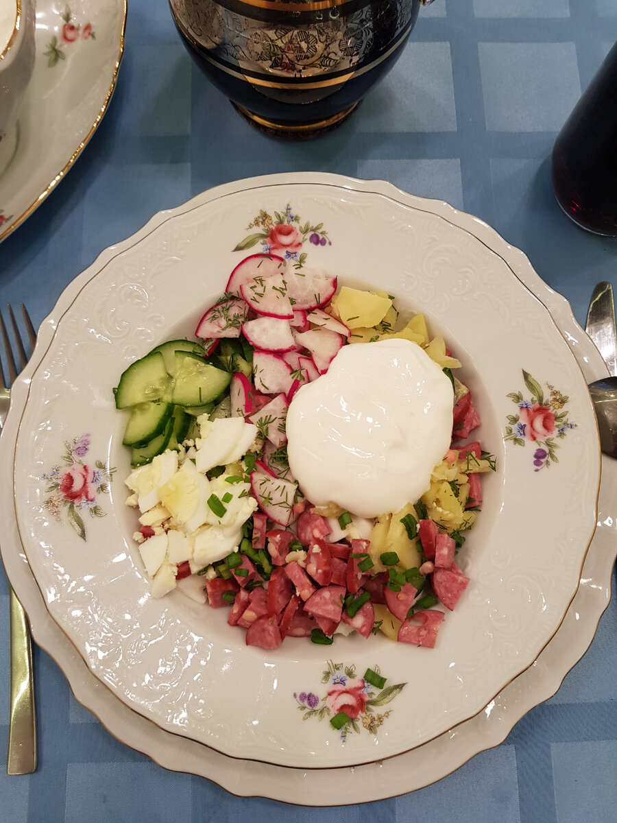 Добрый день, дорогие друзья! Сегодня я приготовила для вас хорошо известный рецепт окрошки, оригинальным является только метод подачи данного блюда. Для приготовления нам понадобятся: зеленый лук, редис 5 штук, картофель 3 штуки, колбаса копченая с кедровыми орешками 400 грамм, огурец 1 штука, яйца куриные 3 штуки, зелень укропа, квас, сметана. Приготовление: яйца и картошку сварить. Нарезать четвертинками колбасу и выложить ее 2 клиньями на блюдо, нарезать четвертинками редиску и выложить под прямым углом к колбасе клиньями. Нарезать яйца четвертинками и выложить под углом 45 градусов к колбасе, нарезать картошку четвертинками и выложить под 45 градусов к колбасе с другой стороны. Нарезать четвертинками огурец и заполнить пространство между яйцами и редиской и между колбасой и картошкой. Мелко нарезать зеленый лук и выложить его между колбасой и яйцами, мелко нарезать укроп и выложить его между картошкой и редисом. При таком оформлении каждый может выбрать и положить в свою тарелку т