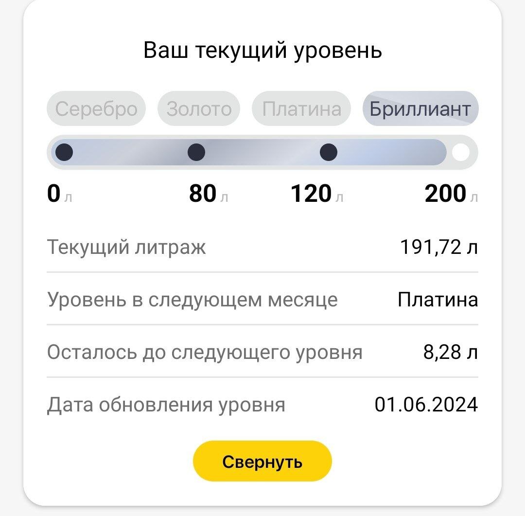 Вот и во вторник. Выезжала из дачи в Обнинске и обязательно нужно было заехать на заправку Роснефть. Кстати, не смогла продержать в программе лояльности статус Бриллиант, не хватило всего 8,28 литра. Но суммарно за месяц я , конечно, больше 200 литров заправила, просто иногда на другие заправки заезжала..