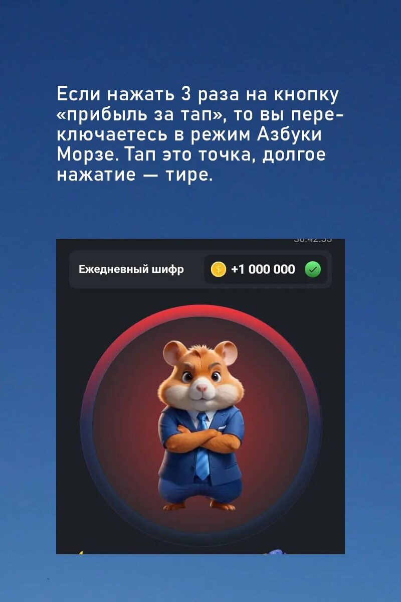В игре появилась азбука морзе, за разгадку которой выдают 1.000.000 поинтов ⬇️КАК ПОЛУЧИТЬ 1КК ПОИНТОВ⬇️ 1️⃣ Заходим в игру и несколько раз нажимаем на плашку "Прибыль за Тап" 2-3 раза. После этого хомяк станет красным 2️⃣ Нажимаем на кнопку фарма — один раз долго и 3 раза быстро. После этого ждём 3-4 секунды 3️⃣ Нажимаем один раз долго, ждём 3-4 секунды 4️⃣ Нажимаем долго, коротко, долго, коротко. И снова ждём 3-4 секунды После этого получаем приз в 1.000.000 поинтов! 🔠Рисунок должен выглядеть так: 1) —... 2) — 3) —.—.