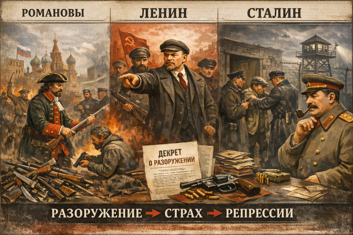Затем — репрессии, произвол или резкое усиление контроля. ---------------------------------------------------------------------------- Разберём по отдельности три периода — Романовы, Ленин, Сталин — с фокусом на разоружение населения и прямые последствия. Кратко, но по существу. Политика в отношении оружия После каждого бунта: Примеры