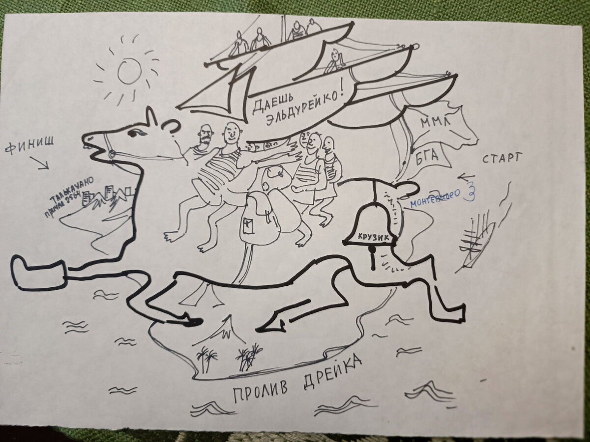 «Тому, кто опасается штурмовать пролив Дрейка на УС "Крузенштерн", предлагается альтернативная программа перехода от Монтевидео до Талькауано сухопутным путем с использованием лошади Киомамоту. Необходимо 12 желающих. Время перехода 2 недели. Встреча "Крузенштерна" в Талькауано на причале № 2453, в местечке Эль-Дурейка. Обеспечивающий - "Интерфлот"". Запись производится в каюте врача-стоматолога.»