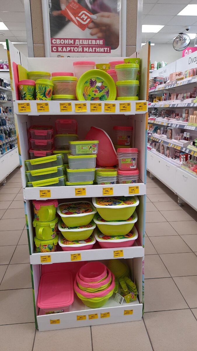 Качественная пластиковая посуда, удобные контейнеры для хранения продуктов.