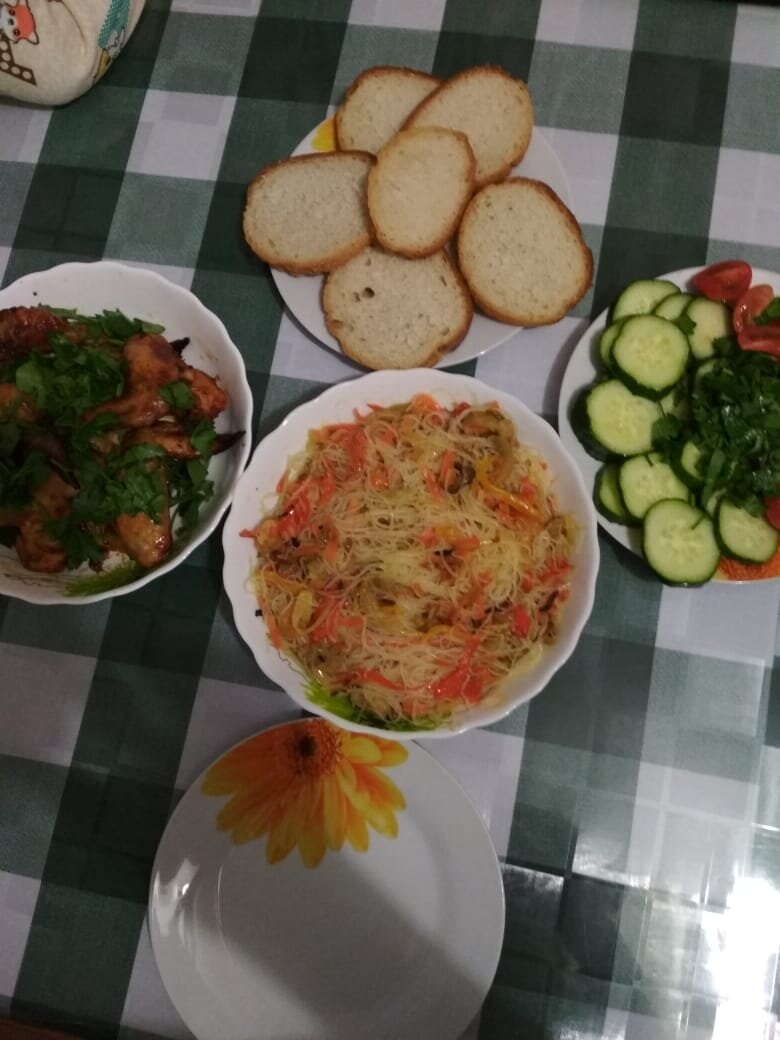 Простой и вкусный салат . Ингредиенты : Фунчоза - 150 г Перец болгарский красный - 1-2 шт. Лук репчатый - 1-2 шт. Морковь свежая (крупная) - 1 шт. Огурец свежий - 1 шт. Соус Чим _чим Соль - по вкусу Масло растительное - для обжарки Приготовление : Фунчоза готова , приятного аппетита !