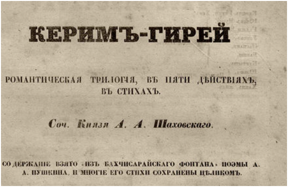 Шаховской, автор «романтической трагедии в трех действиях, взятой из поэмы А. С. Пушкина», носившей заглавие «Керим-Гирей или Бахчисарайский фонтан», воспользовался соответствующими возможностями пушкинского текста довольно искусно. В тексте «романтической трагедии» сохранено некоторое количество пушкинских стихов, которые разбавлены стихами Шаховского. Понятно, что в монологе Заремы пушкинских 'стихов — максимальное количество, но интересно то, что, начиная со стиха: «Я знаю: не твоя вина», до самого конца монолога, если не считать двух небольших отступлений от пушкинского текста, вызывавшихся неизбежными требованиями техники, Шаховскому не понадобилось добавлять к стихам Пушкина ни одного своего стиха. И все это место имело соответствующий успех на сцене. Историк театра Арапов сообщает: «Сцена, когда Зарема, в кипучей ревности, любуется спящею Мариею, вышла в представлении чрезвычайно рельефна…»